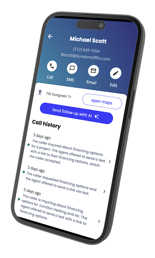 Answers calls 24/7, books appointments, offers financing, and follows up on estimates—so you can focus on the job and never miss a lead again.